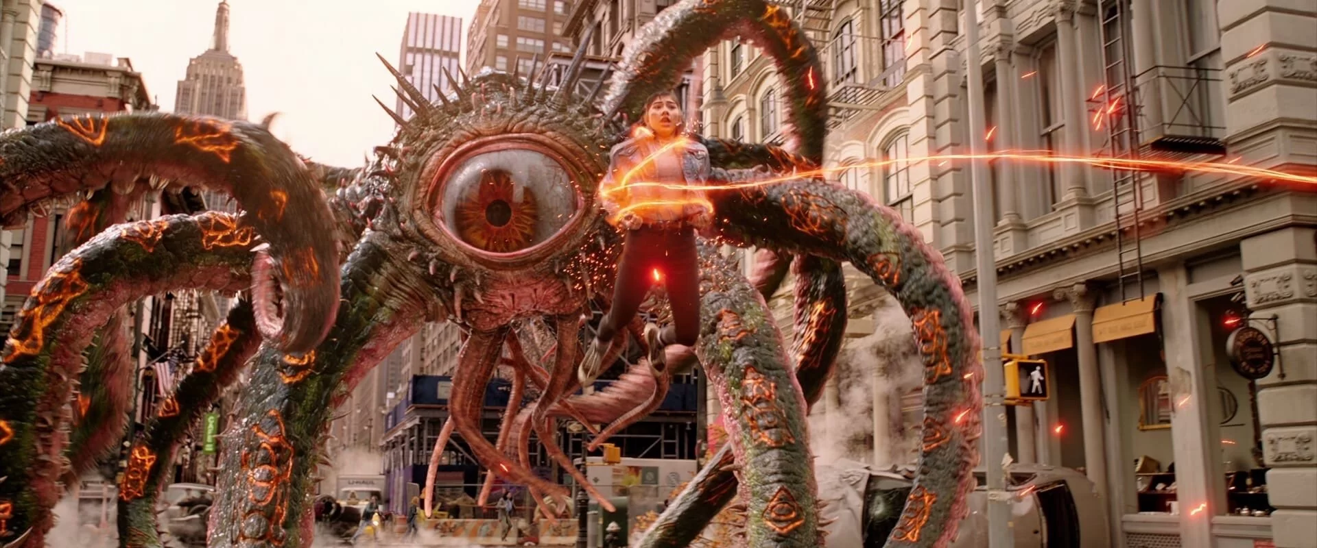 5. **Смена костюма Стрэнджа:** В одной из сцен на церемонии бракосочетания Стрэндж надевает смокинг, но позже, когда он использует магию для борьбы с монстром, его одежда внезапно меняется на магическую мантию. Это изменение происходит без объяснений и выглядит как киноляп, хотя можно предположить, что он использовал магию для смены костюма, но этот момент остаётся неочевидным.