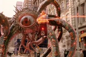 1. **Возвращение Сэма Рэйми:** Режиссер Сэм Рэйми, известный своей работой над трилогией "Человек-паук" и культовыми хоррорами, вернулся к миру супергероев после долгого перерыва. Это добавило фильму элементы ужаса и напряжения, с характерным для Рэйми визуальным стилем. Особенно заметны сцены с Вандой Максимофф, где использовались приемы из классических фильмов ужасов.
